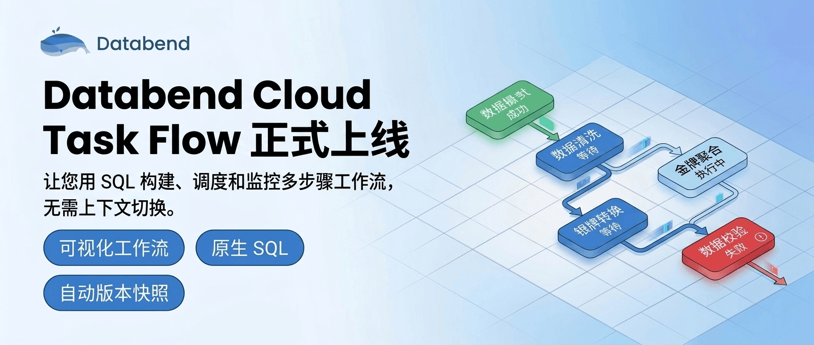 Databend Cloud Task Flow 让你用 SQL 构建、调度和监控多步骤工作流,无需额外基础设施,无需上下文切换,一切都在数据所在的平台里完成。Task Flow 是 Databend Cloud 内置的工作流编排功能。