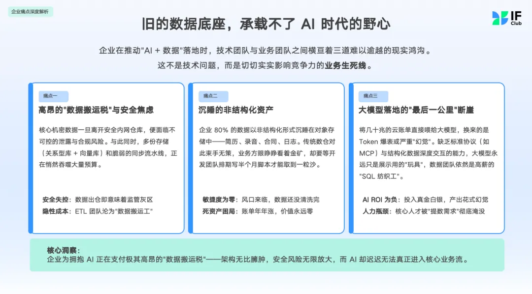 一旦业务场景增加,维护成本就会快速上升 所以很多企业并不是缺一个模型,而是缺一个真正适合 AI 工作方式的新型数据底座。