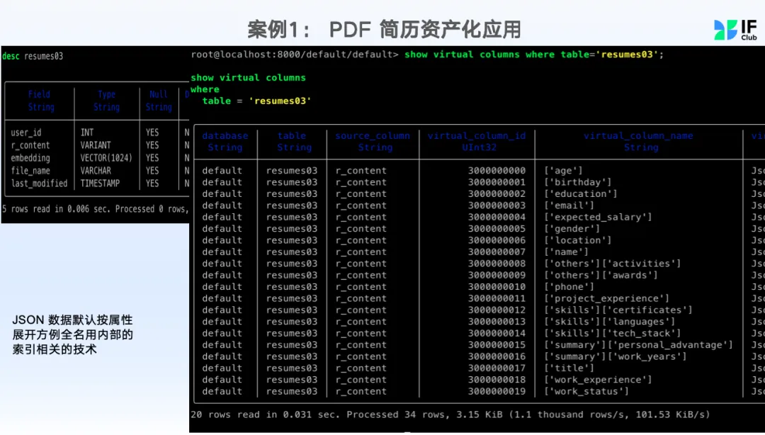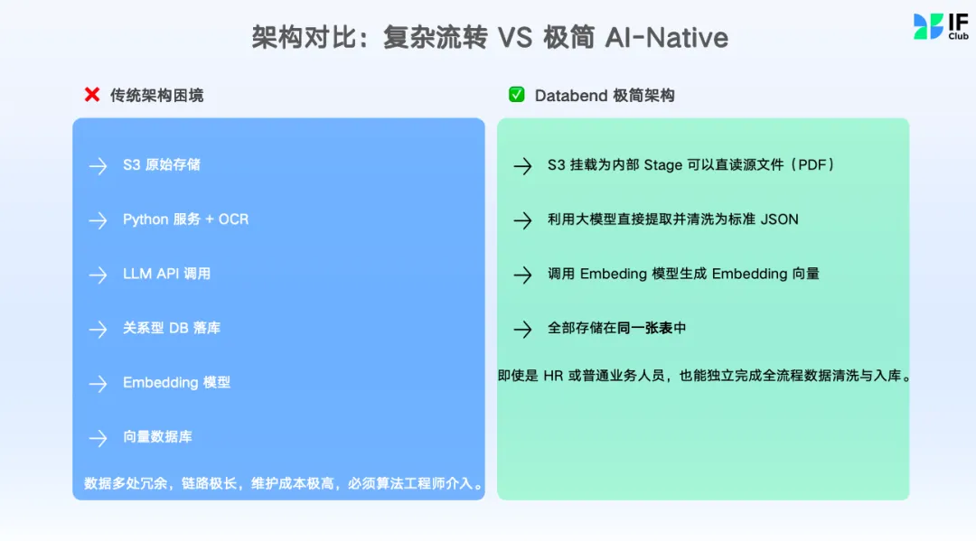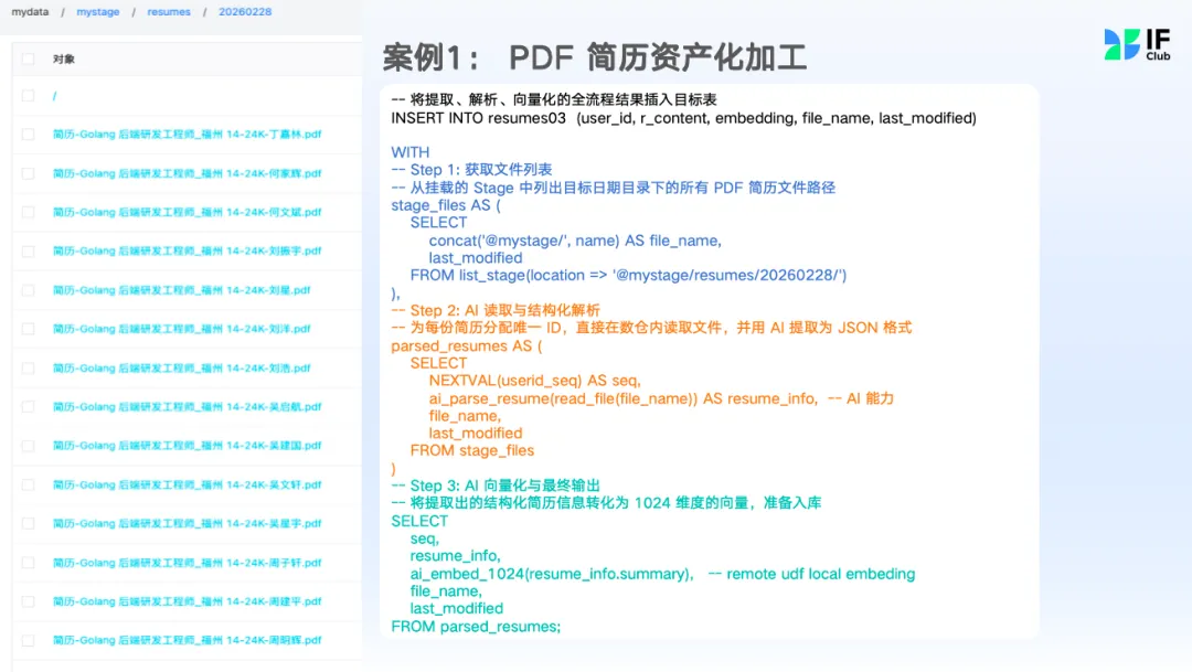 利用 Databend 一个 SQL 把非结构化的简历,半结构化及向量的资源,供后续的 AI 使用:
