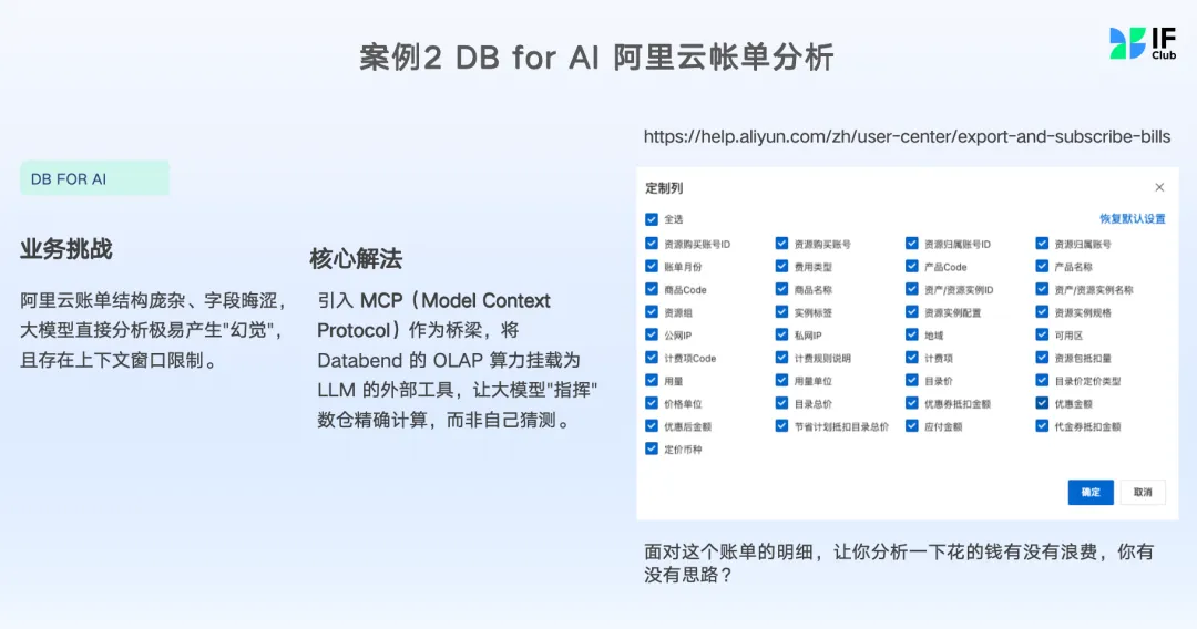 - 业务挑战:阿里云账单位明细极其复杂。大模型直接读取存在严重“幻觉”问题与上下文 Token 限制