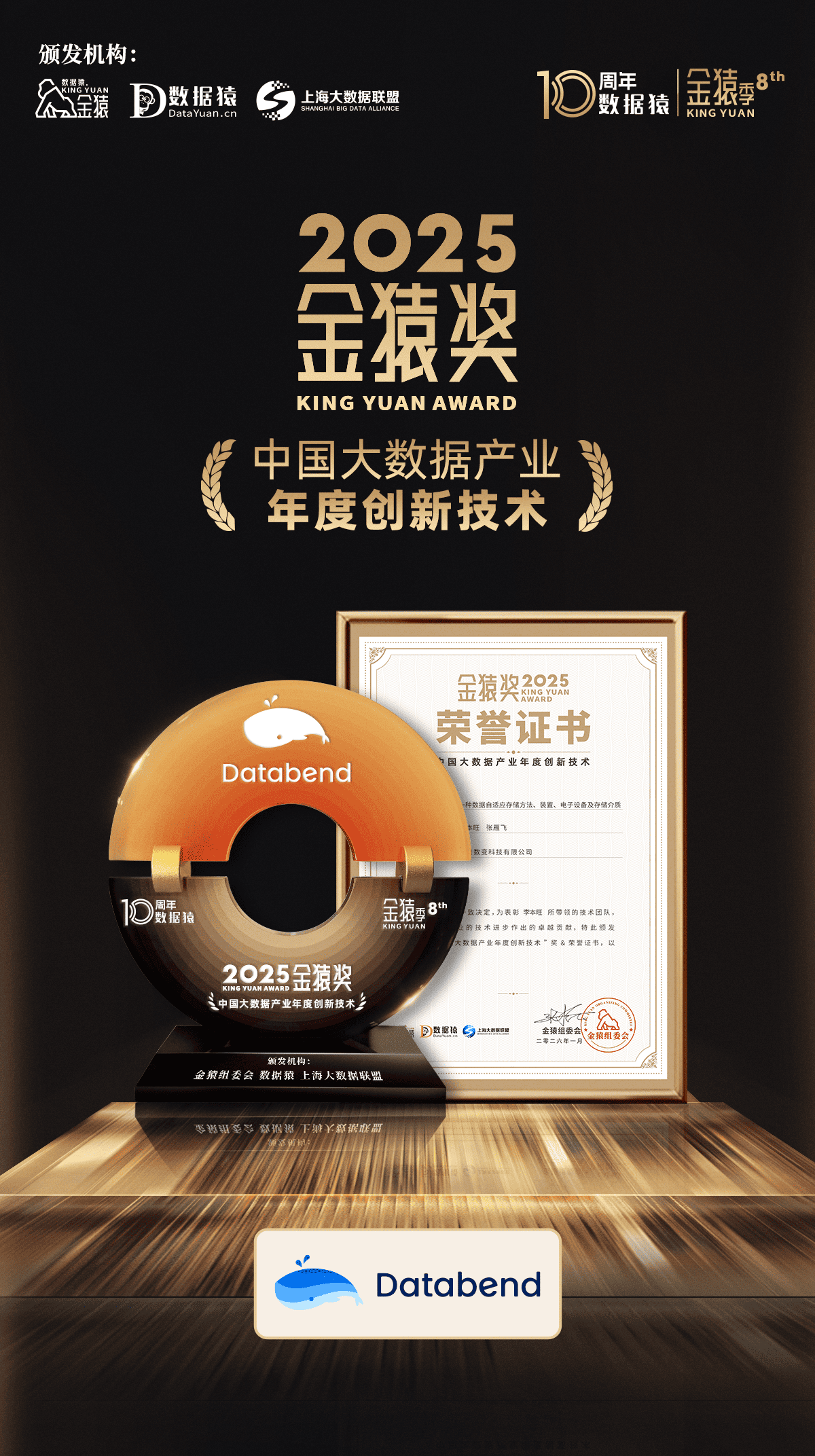 2026年1月14日,Databend(北京数变科技有限公司) 在第八届金猿大数据产业发展论坛上,凭借其“一种数据自适应存储方法、装置、电子设备及存储介质”专利技术(专利公开号:CN117786169B),荣获“2025中国大数据产业年度创新技术”奖项。