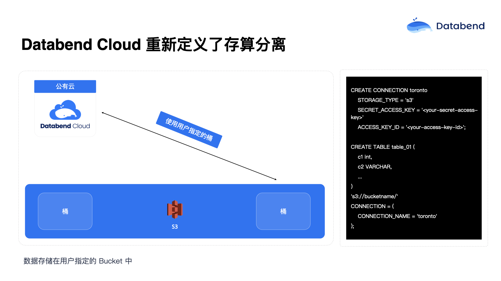 过去说存算分离,通常意味着计算是一层,存储是一层。而 Databend 现在做到的新状态是计算放在 Databend 端,平时用户所使用的 SQL IDE、资源管控,包括资源伸缩等所有内容由 Databend 管理;但数据可以存放在用户自己的桶(Bucket)中。通过这种方式,用户数据在自己的存储中会更加放心。